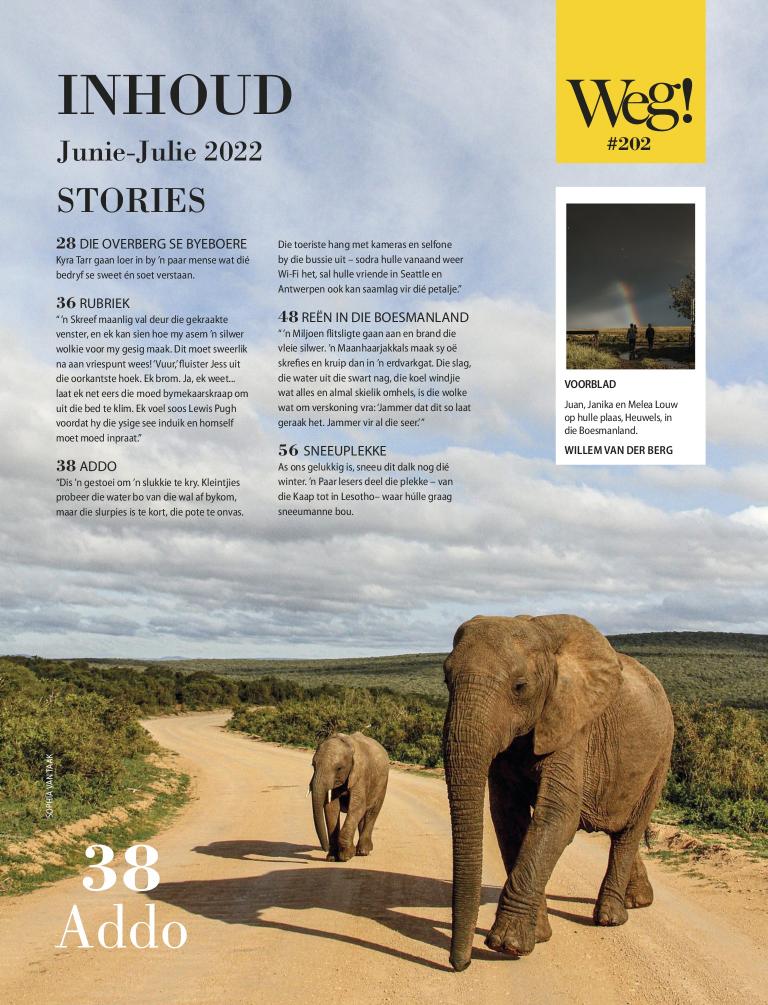 Suid-Afrika se voorste reistydskrif is enige buitelewemens se paspoort tot bekostigbare bestemmings en blyplek in Suidelike-Afrika. Elke uitgawe is volgepak met puik foto’s en gesaghebbende stories oor interessante mense en plekke (en wat om daar te doen). Kamp, voetslaan, fotografie, toerusting, kos, die langpad, en avontuur is ook deel van Weg se DNS. En omdat ons nie freebies aanvaar nie en self vir alles betaal, weet lesers hulle kan ons inligting vertrou. Of jy wil wegbreek vir die naweek of ’n lang vakansie, jou reis begin hier...