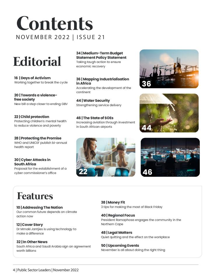 senior leaders in public service and the public sector in general, Public Sector Leaders speaks to an audience with the highest level of authority - government decision-makers. With a digital readership of 40 000 monthly, Public Sector Leader is the only specialised platform that offers a window of opportunity for marketers and communicators in both the public and private sectors to engage with an audience of senior government officials. As a group, this audience presides over a procurement budget of more than R150 billion per annum and their requirement list includes both products and services from the corporate sector. Their procurement decisions range from acquiring technology solutions, legal services, performance tools, audit services, communication solutions, catering services, security, office equipment, buildings and facilities, environmental products, waste-management solutions and general products. The Purpose of the Brand: Celebrating and showcasing trusted ethical and best practice in the public sector to an African & global audience - highlighting innovation, policy making and community initiatives Shining an independent light on what public servants are doing Our goal is to start in South Africa and grow into Africa