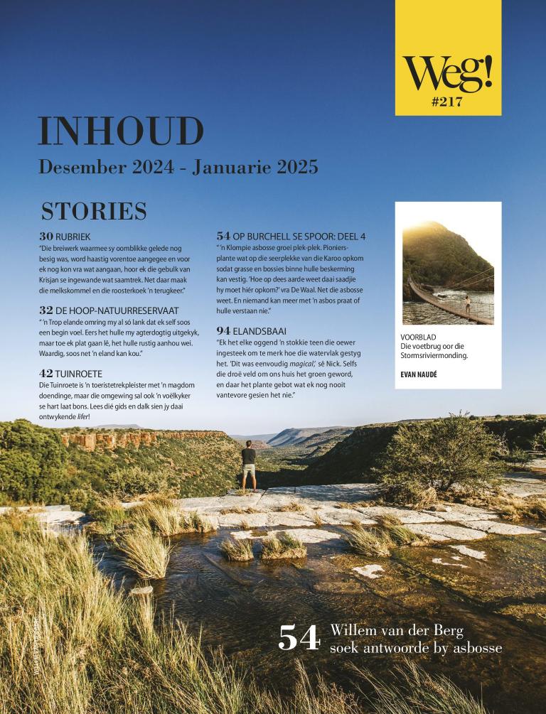 Suid-Afrika se voorste reistydskrif is enige buitelewemens se paspoort tot bekostigbare bestemmings en blyplek in Suidelike-Afrika. Elke uitgawe is volgepak met puik foto’s en gesaghebbende stories oor interessante mense en plekke (en wat om daar te doen). Kamp, voetslaan, fotografie, toerusting, kos, die langpad, en avontuur is ook deel van Weg se DNS. En omdat ons nie freebies aanvaar nie en self vir alles betaal, weet lesers hulle kan ons inligting vertrou. Of jy wil wegbreek vir die naweek of ’n lang vakansie, jou reis begin hier...