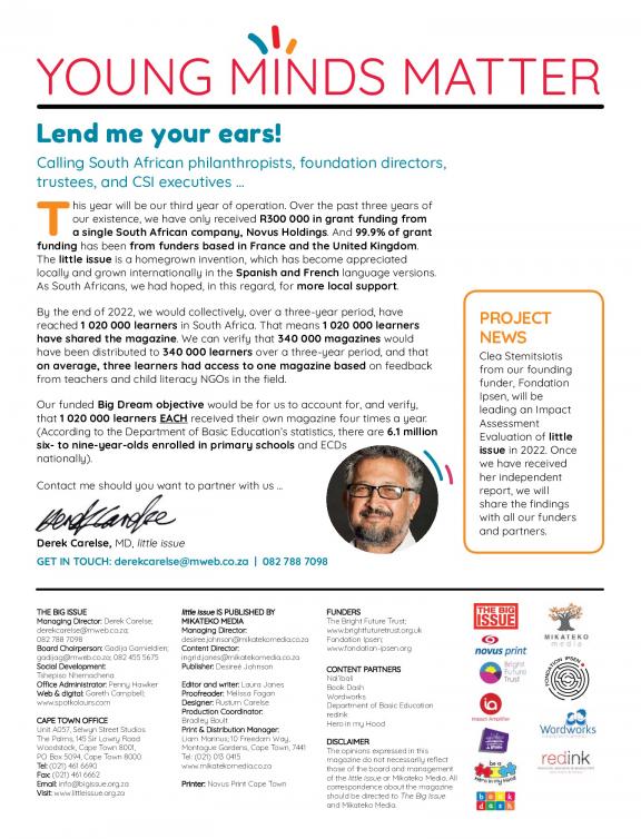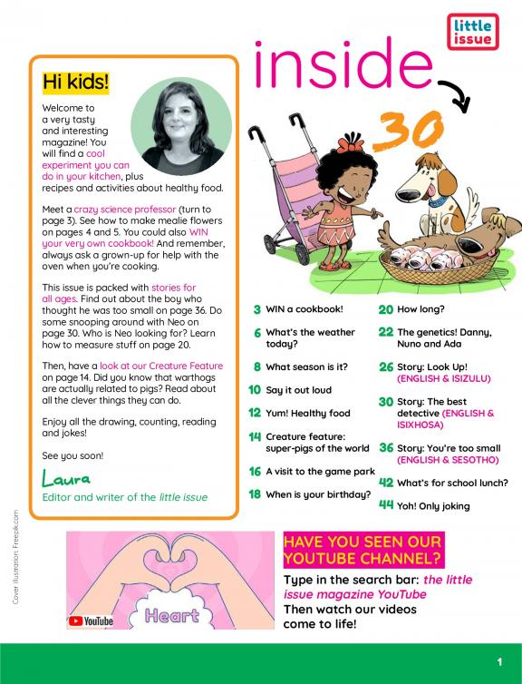 little issue is a quarterly magazine aimed at learners in the foundation phase (Grade R –3). The magazine supports foundation phase learners with fun, interactive learning material that supports their early learning. Content is aligned to the Department of Basic Education’s National Curriculum Framework for the foundation phase.