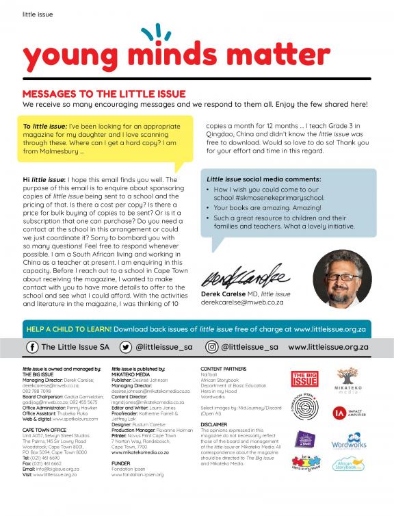 little issue is a quarterly magazine aimed at learners in the foundation phase (Grade R –3). The magazine supports foundation phase learners with fun, interactive learning material that supports their early learning. Content is aligned to the Department of Basic Education’s National Curriculum Framework for the foundation phase.